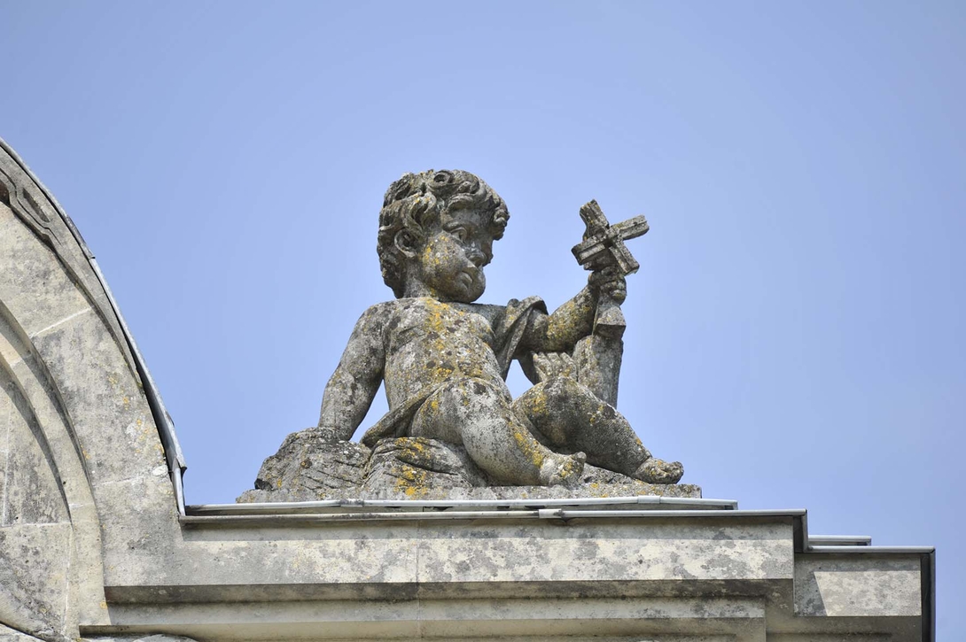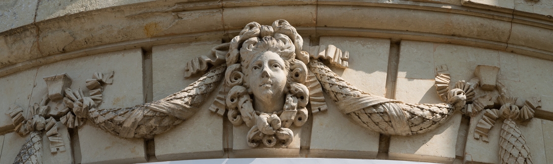 Sculptée en tuffeau, la façade est décorée de mascarons (tête de femmes) et de draperies.