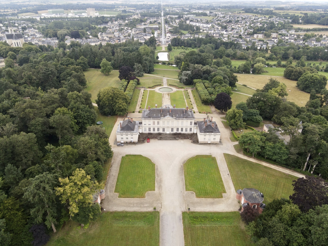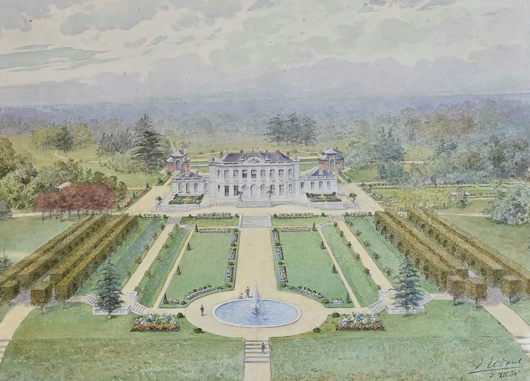 Le jardin à la française fut construit dans l'axe du château et de la route de Nantes. On distingue dans le fond du parc le bassin des cygnes et la grille de Bel air qui clôt le parc.