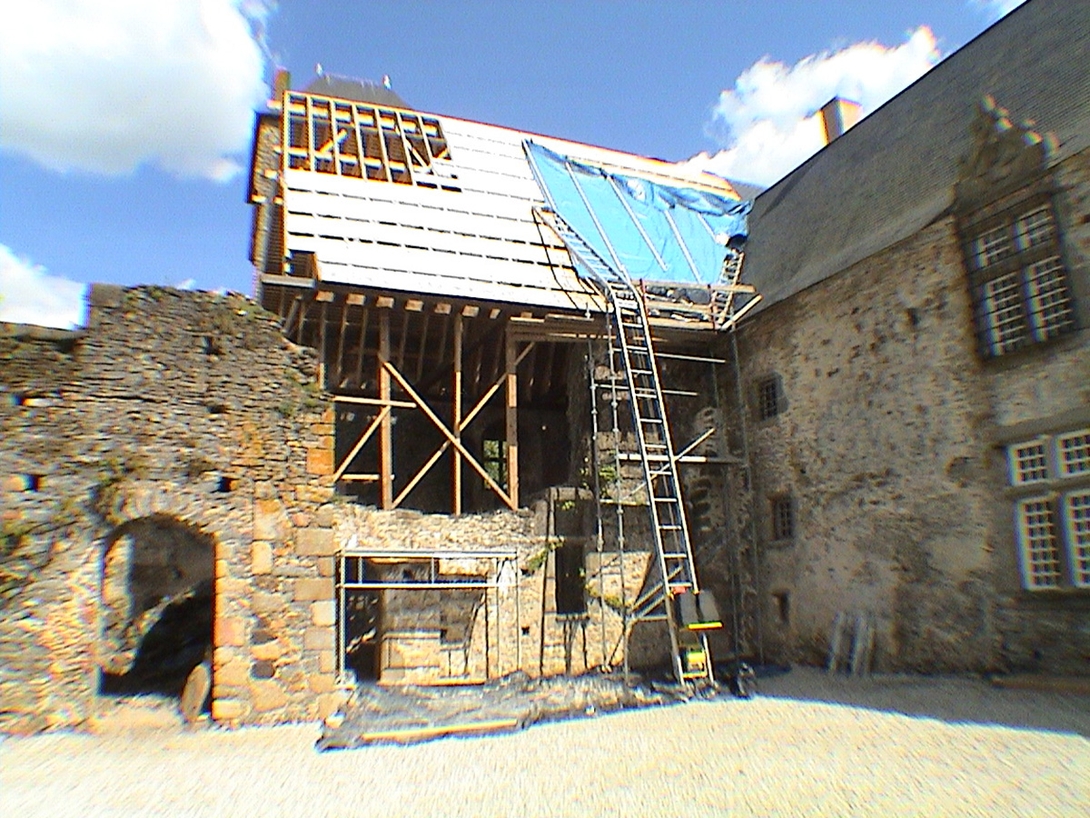 Vers 1846, les logis seigneuriaux sont en partis découverts. Image Déclassés, ils sont convertis en ferme et greniers ; les toitures sont rabaissées, vers 1972. Image À partir de 2002, la restauration restitue les toitures du Logis Neuf Image de la Grande Salle Image et du Vieux Logis Image