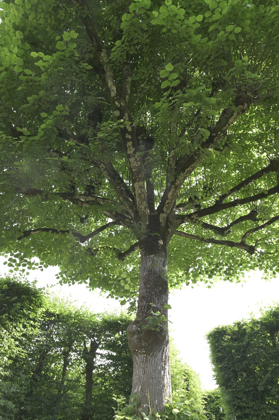 Ici nous sommes dans une charmille carrée, avec une entrée à chaque angle. Un très beau tilleul marque le centre, taillé de façon à ce que les branches partent au même niveau pour former comme les rayons d’un soleil.