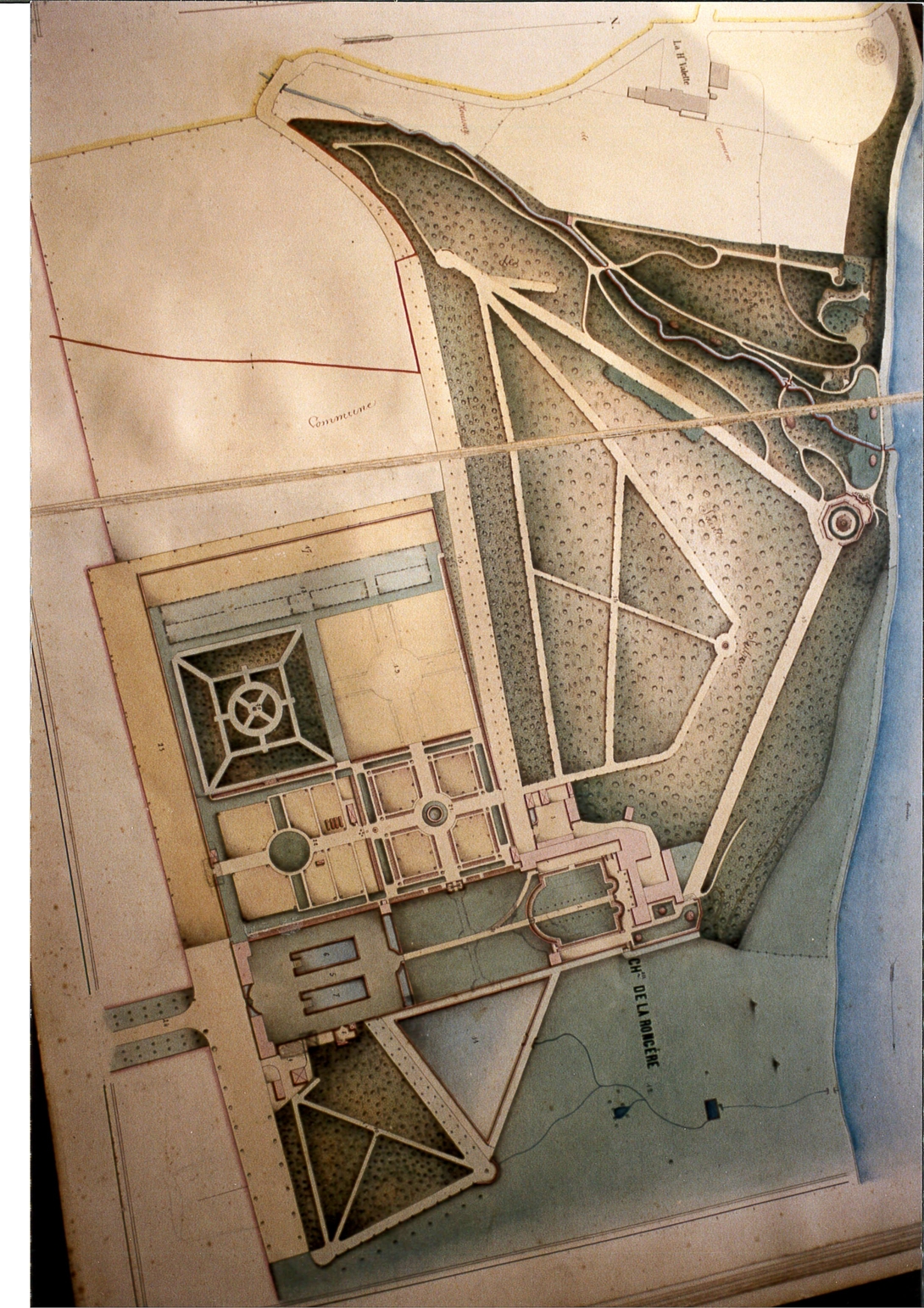 - Un ensemble carré, séparé lui-même en quatre carrés sur 4 NIVEAUX DIFFERENTS : de bas en haut : le potager d’agrément à droite, puis le verger d’agrément à gauche, ensuite un peu plus loin, l’ancien boulingrin à droite et pour terminer le dédalle ou quinconce à gauche