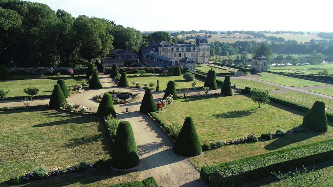 Les broderies de buis et les ifs centenaires taillés en topiaires coniques rappellent que nous sommes dans un jardin à la Française, évoquant les jardins de Le Nôtre.