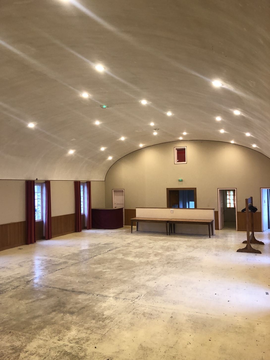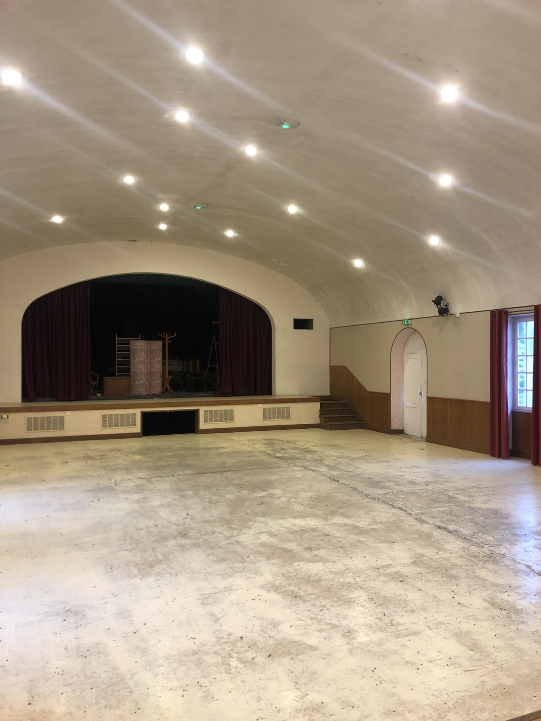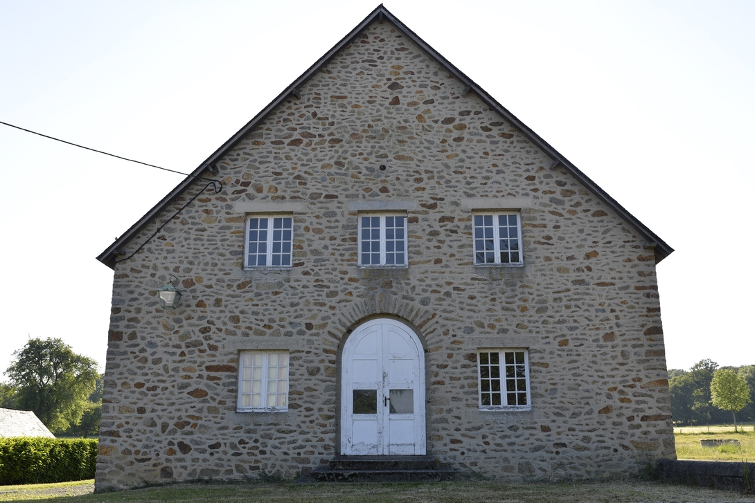 Construite en 1965-1966 par les dirigeants de l’entreprise Toiles de Mayenne, cette salle des fêtes montre elle aussi une des aspirations des bâtisseurs du village au 20ème siècle : relier la terre et le ciel.