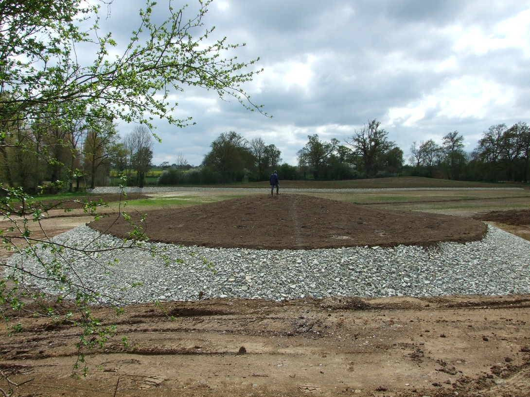 Nous avons donc souhaité, dans « l’esprit renaissance » que les Arcis aient eux aussi leur labyrinthe. Nous avons choisi de dessiner un irrgarten, avec comme cela se fait parfois, non pas un, mais deux chemins pour arriver au but. Le promeneur entre dans un labyrinthe de charmes. Parvenu au centre, il peut admirer une belle vue dégagée sur l’étang : la forme de l’ile (en dôme) a été conçue pour que le regard passe avec aisance au-dessus des haies au sommet de l’île (qui est aussi le centre du labyrinthe).