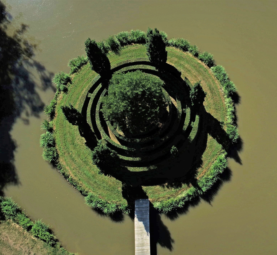 Six chênes pyramidaux sont plantés dans le cercle le plus externe du labyrinthe ; Les berges de l’île sont renforcées par un enrochement, efficace, mais le plus discret possible, afin que les rives ne s’affaissent pas dans le temps.
