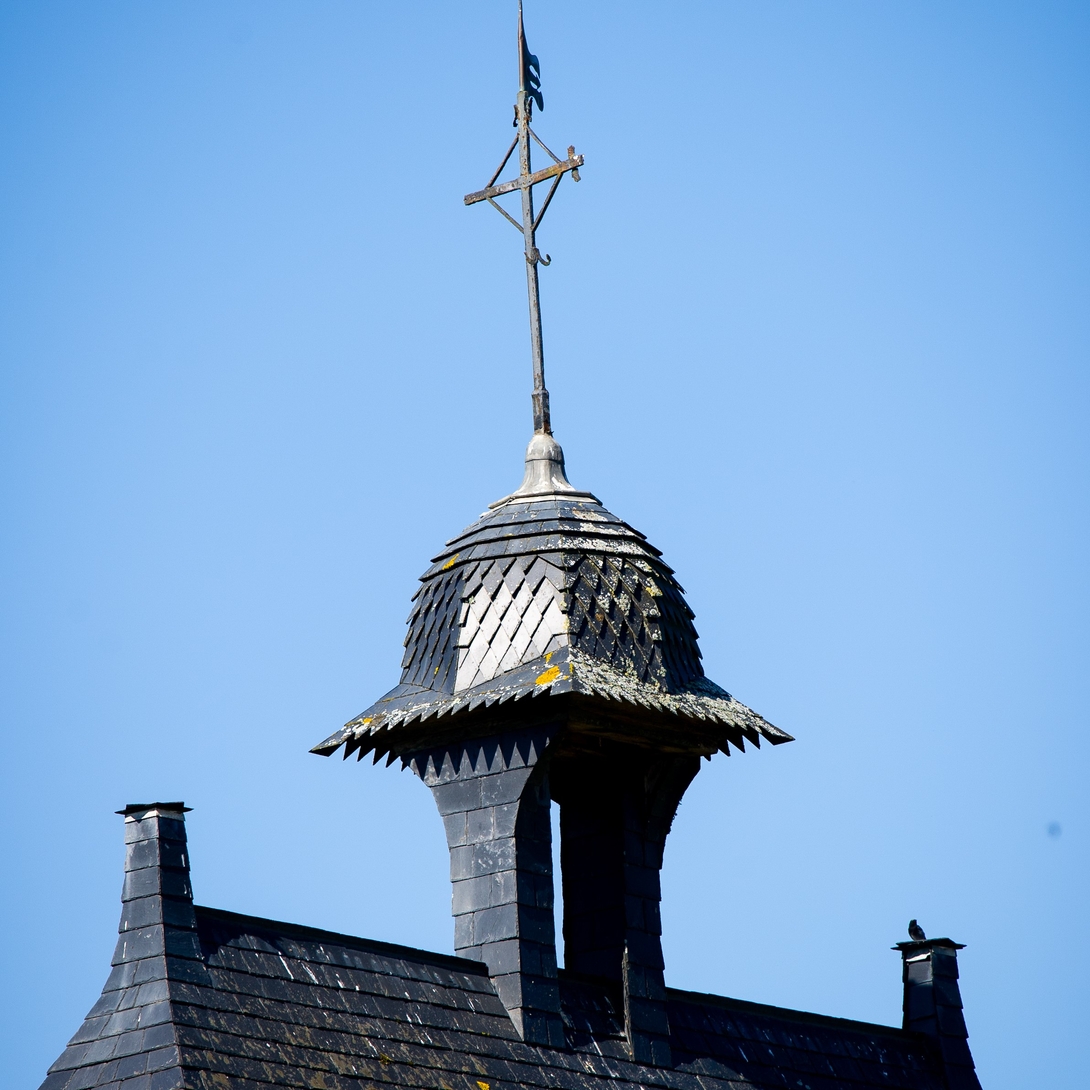 À l’extérieur, vous pouvez admirer le clocheton et sa croix, agrémenté d’une girouette. Il fut restauré par un compagnon couvreur qui ne cacha pas son plaisir à réaliser ce beau travail (une semaine !). Les ardoises sont posées « au clou », taillées avec un pureau décoratif, et ce sur huit versants pour la « cloche » qui prend appui sur une base carrée, bordée par une véritable « dentelle » en ardoise. Les deux petits épis de faîtage sont typiques de l’époque, recouvert d’une ardoise taillée en étoile.
