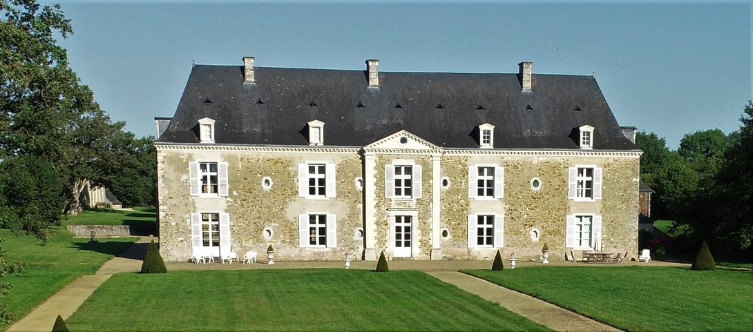 Cependant … sur la façade côté jardin des oculi ornent la façade : un au centre du fronton et quatre par niveaux. Les oculi, comme les portes et fenêtres ont des entourages en tuffeau. La corniche est également en tuffeau, pierre typique de l’Anjou. On retrouve dans les façades quelques pierres de Roussard, venant du nord du Maine, dont la couleur « rouille » vient du fer qui y est inclus.