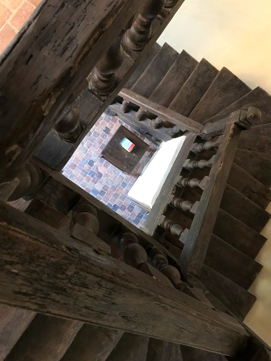 Un escalier de bois aux balustres sculptées permet de monter à l’étage. La charpente a été restaurée selon les règles de l’art en conservant les belles chevilles originelles. On remarquera que pour ce bâtiment de service les ouvrages sont aussi soignés que pour un bâtiment d’habitation.